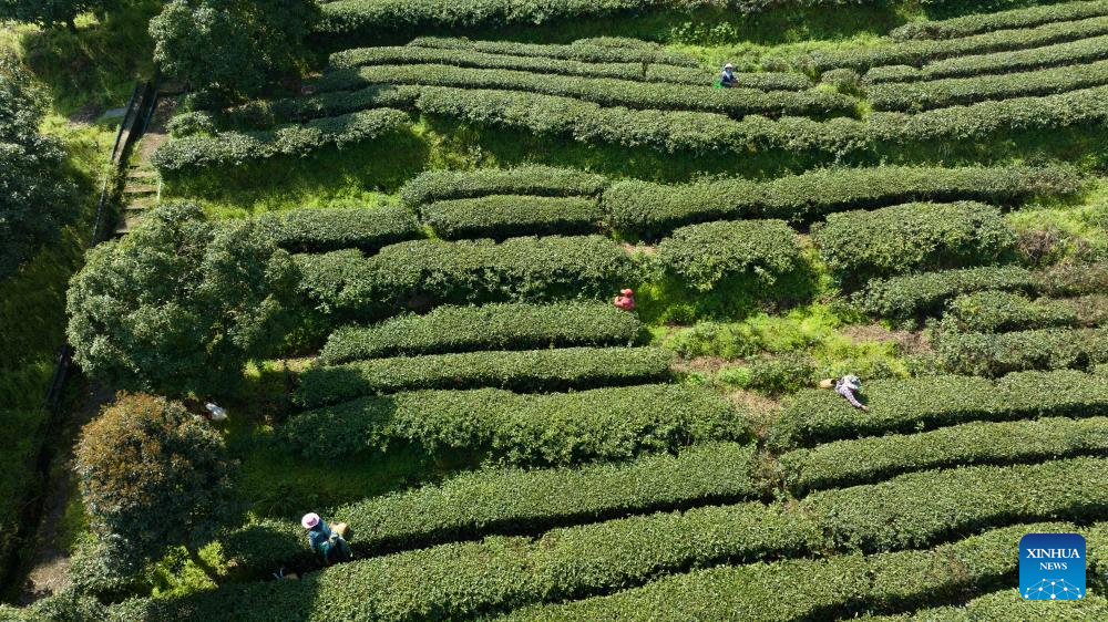 A drone photo shows farmers picking tea leaves at a tea garden in Fuxi Township in Huangshan City, east China's Anhui Province, March 28, 2024. Tea farmers and enterprises are busy harvesting and processing spring tea leaves to meet the consumer demand lately. (Xinhua/Huang Bohan)