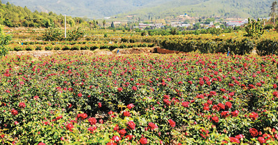 Photo shows edible rose fields in Bajie subdistrict, An'ning, a county-level city overseen by Kunming, capital of southwest China's Yunnan Province. (Photo courtesy of the publicity department of the Communist Party of China An'ning municipal committee)