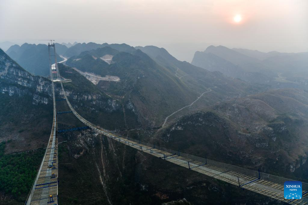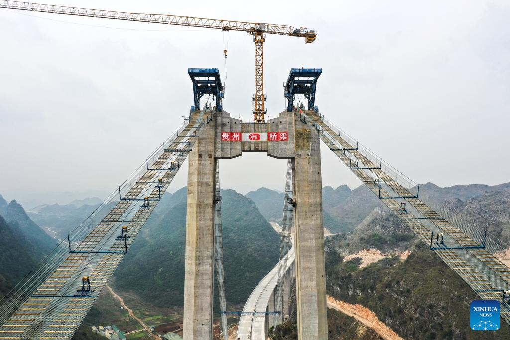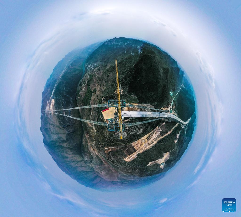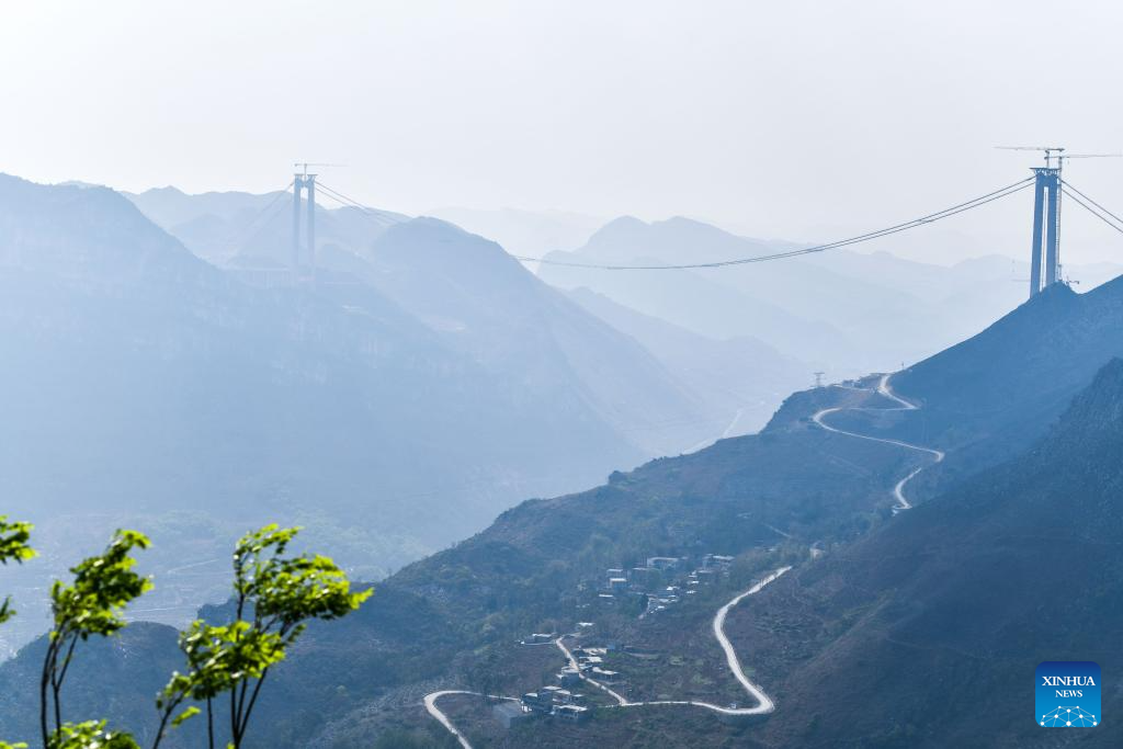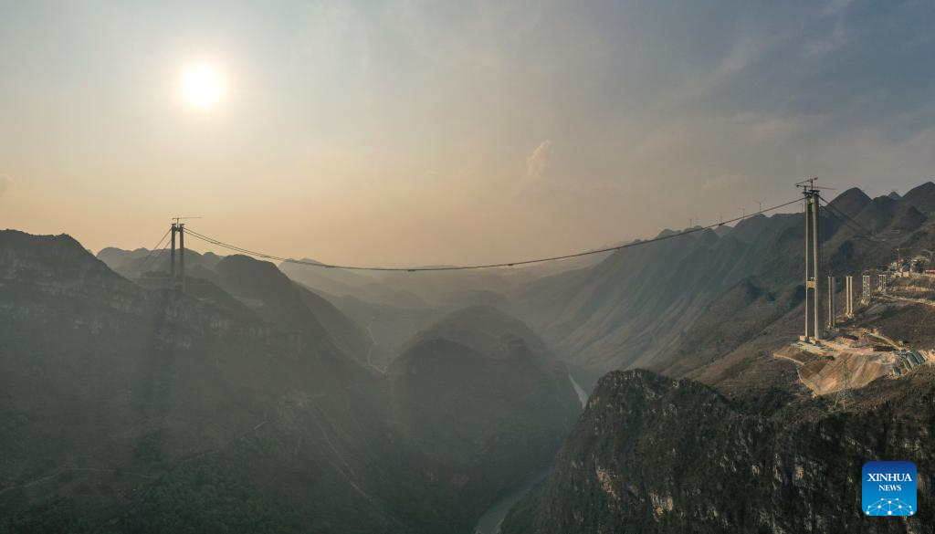 This photo taken on March 27, 2024 shows the construction site of the Huajiang grand canyon bridge in southwest China's Guizhou Province. With a designed height of 625 meters between the bridge deck and the Beipanjiang River below, the Huajiang grand canyon bridge is set to be the highest in the world after it is completed in 2025.