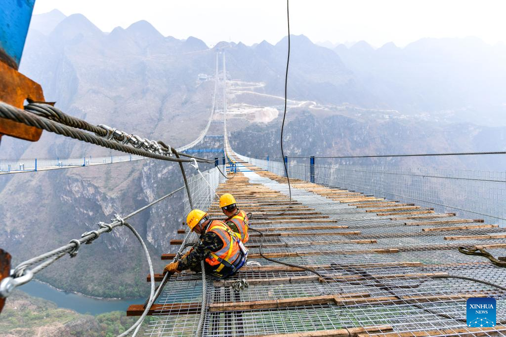 People work at the construction site of the Huajiang grand canyon bridge in southwest China's Guizhou Province, March 27, 2024. With a designed height of 625 meters between the bridge deck and the Beipanjiang River below, the Huajiang grand canyon bridge is set to be the highest in the world after it is completed in 2025.