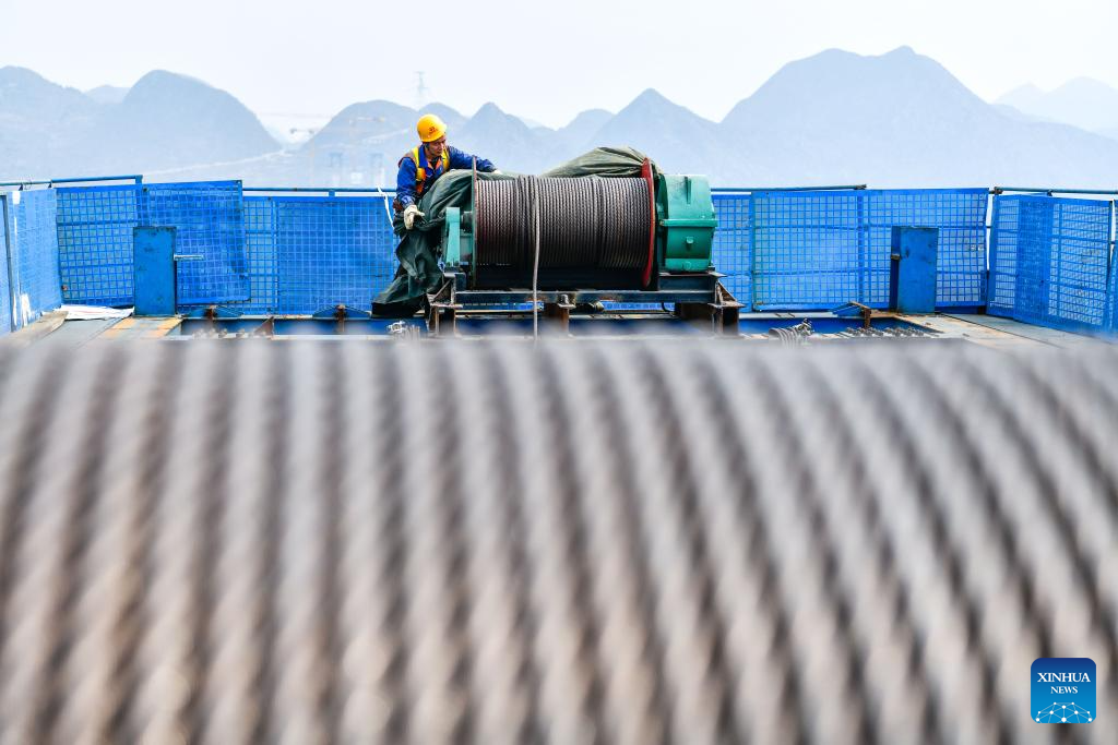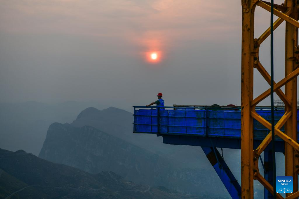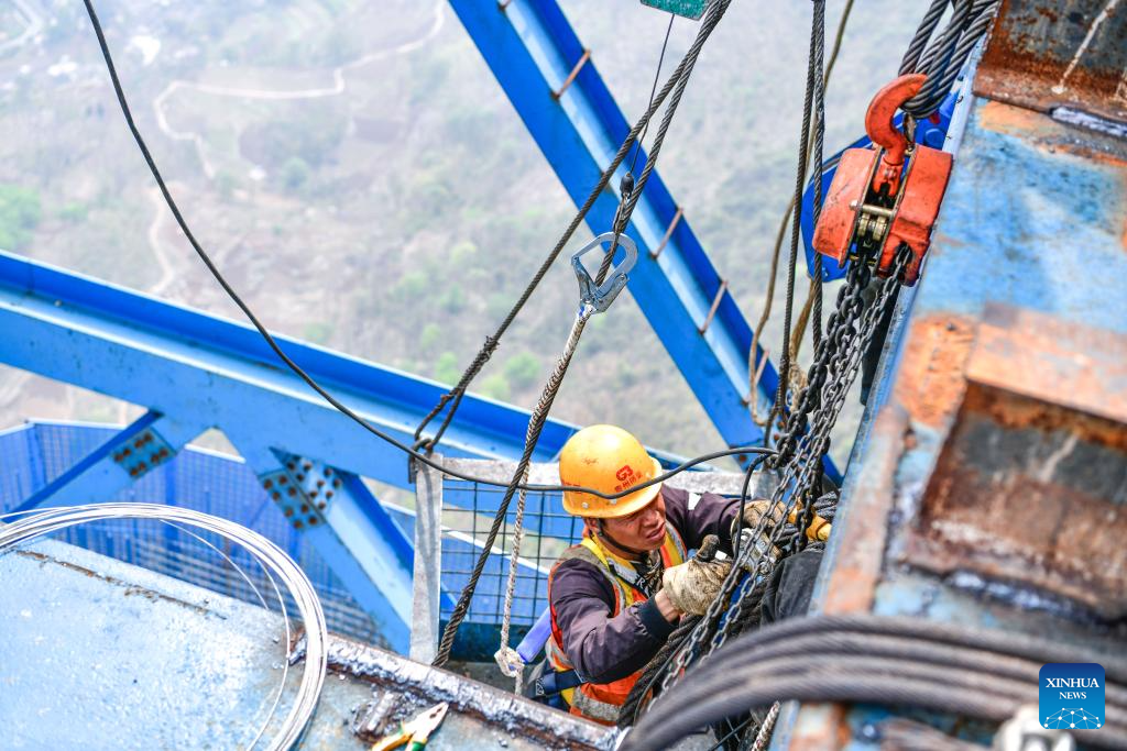 A man works at the construction site of the Huajiang grand canyon bridge in southwest China's Guizhou Province, March 26, 2024. With a designed height of 625 meters between the bridge deck and the Beipanjiang River below, the Huajiang grand canyon bridge is set to be the highest in the world after it is completed in 2025.