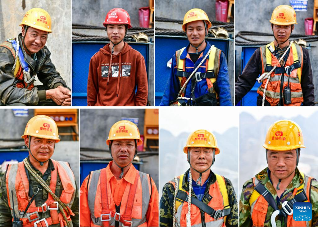 This combo photo taken on March 27, 2024 shows portraits of constructors of the Huajiang grand canyon bridge in southwest China's Guizhou Province. With a designed height of 625 meters between the bridge deck and the Beipanjiang River below, the Huajiang grand canyon bridge is set to be the highest in the world after it is completed in 2025.