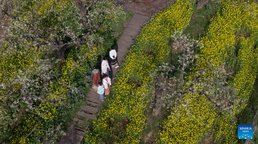 An aerial drone photo taken on March 29, 2024 shows tourists visiting a scenic area in Huaibei, east China's Anhui Province. The warm weather and blooming flowers are attracting people out of their homes to enjoy the spring. (Xinhua/Fu Tian)