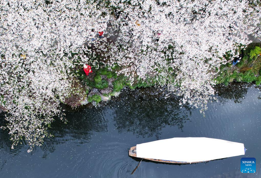 An aerial drone photo taken on March 29, 2024 shows cherry blossoms in Yangzhou, east China's Jiangsu Province. The warm weather and blooming flowers are attracting people out of their homes to enjoy the spring. (Photo by Meng Delong/Xinhua)