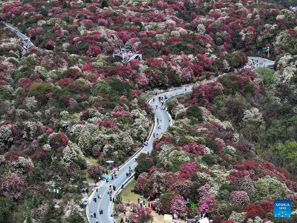 An aerial drone photo taken on March 29, 2024 shows tourists visiting the Bijie Baili Azalea scenic area in Bijie, southwest China's Guizhou Province. The warm weather and blooming flowers are attracting people out of their homes to enjoy the spring. (Photo by Chen He/Xinhua)