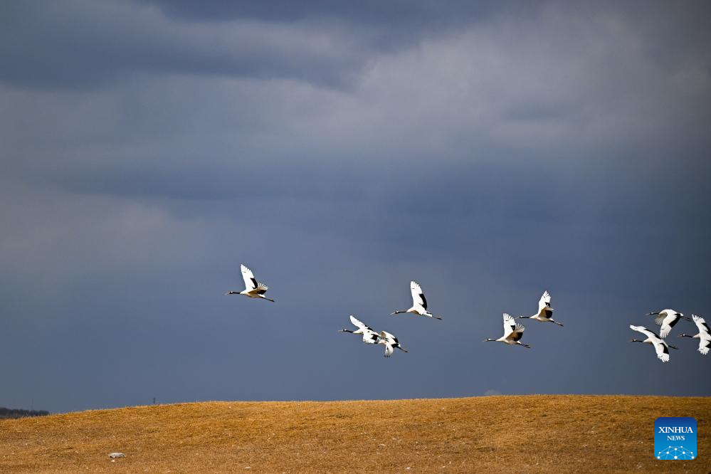 Red-crowned cranes fly at Zhalong National Nature Reserve in Qiqihar, northeast China's Heilongjiang Province, March 29, 2024. Zhalong National Nature Reserve provides a major habitat for red-crowned cranes and other wildlife. (Xinhua/Chen Yichen)