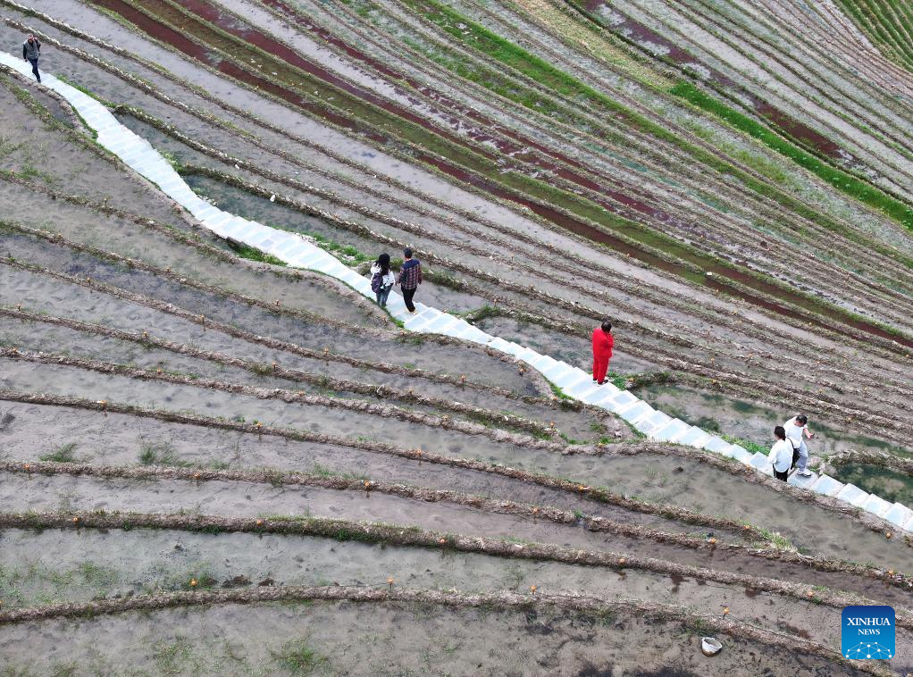 An aerial drone photo taken on March 28, 2024 shows tourists visiting the Longji terraced field in Longsheng County, south China's Guangxi Zhuang Autonomous Region. (Xinhua/Zhou Hua)