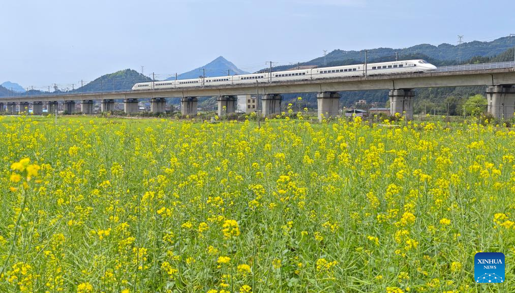This photo taken on March 29, 2024 shows a bullet train running on a section of the Guizhou-Guangzhou high-speed railway in Zhongshan County, south China's Guangxi Zhuang Autonomous Region. (Photo by Liao Zuping/Xinhua)