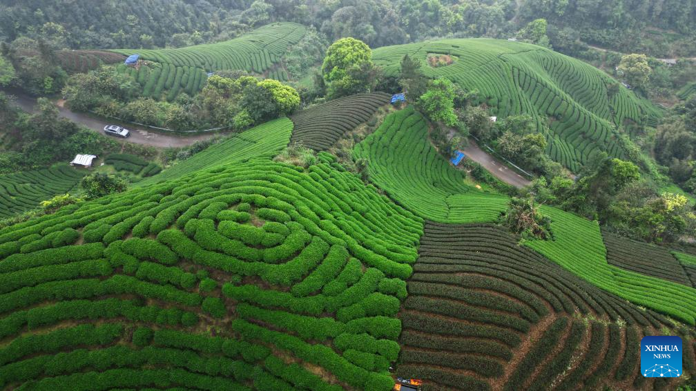 An aerial drone photo taken on March 30, 2024 shows a car running on a road at a tea garden in Zhaoping County, Hezhou City, south China's Guangxi Zhuang Autonomous Region. (Photo by Huang Xuhu/Xinhua)