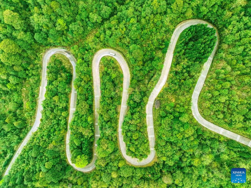 An aerial drone photo taken on March 29, 2024 shows a car running on a winding road in Laibin City, south China's Guangxi Zhuang Autonomous Region. (Photo by Gao Rujin/Xinhua)