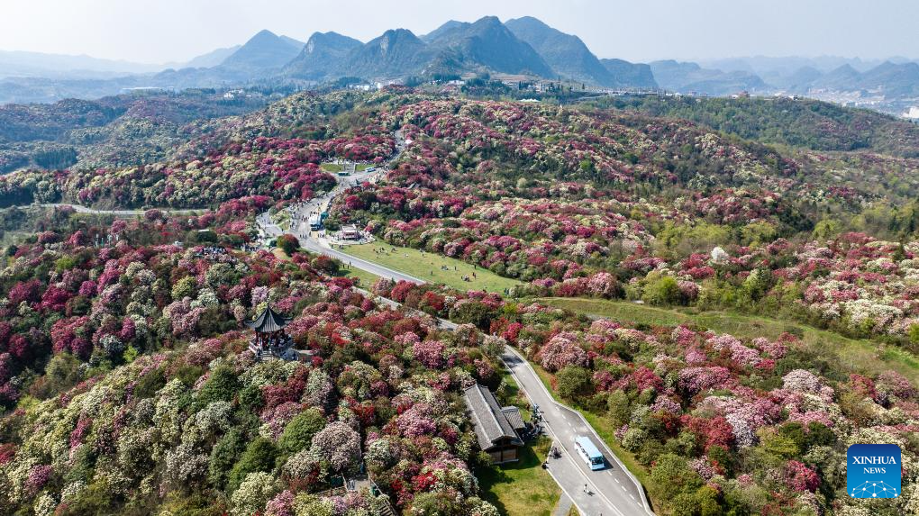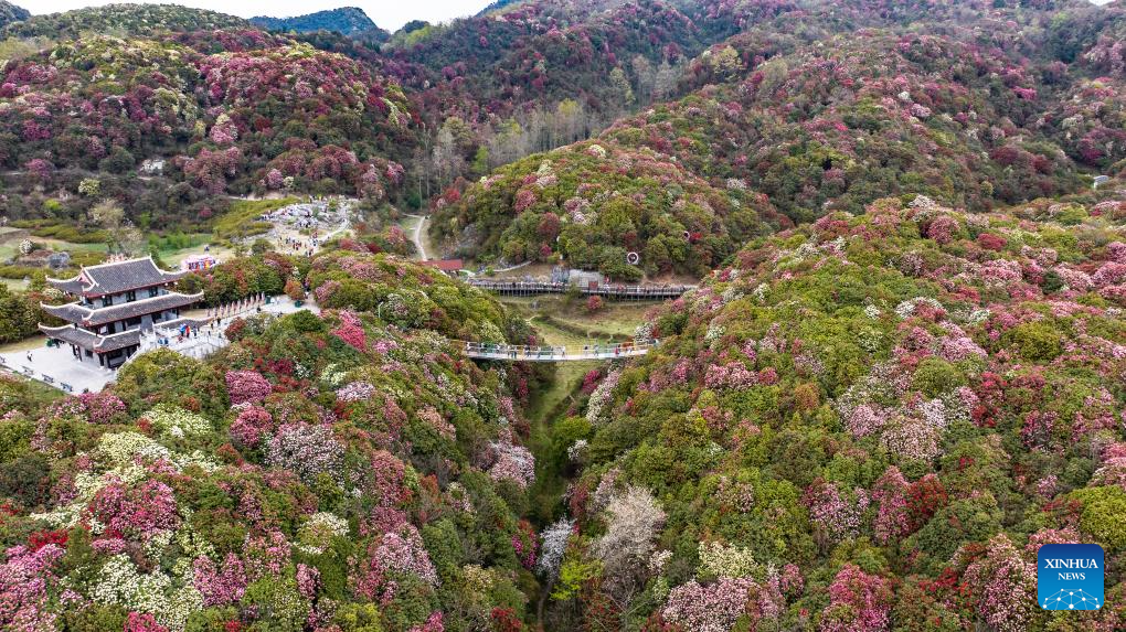 An aerial drone photo taken on March 29, 2024 shows a view of an azalea scenic area in Bijie, southwest China's Guizhou Province. (Xinhua/Tao Liang)