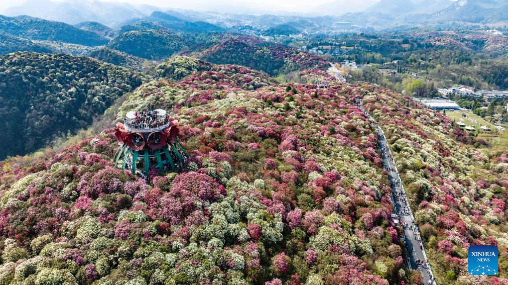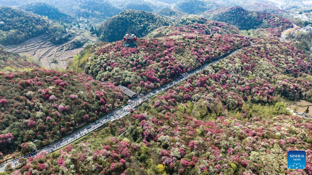 An aerial drone photo taken on March 29, 2024 shows tourists visiting an azalea scenic area in Bijie, southwest China's Guizhou Province. (Xinhua/Tao Liang)