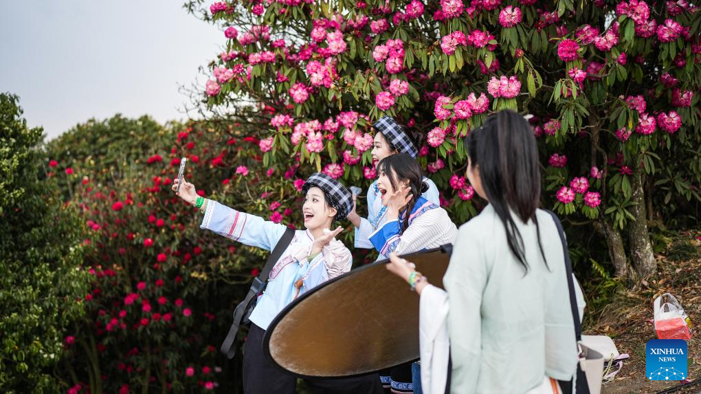 Tourists take selfies at an azalea scenic area in Bijie, southwest China's Guizhou Province, March 29, 2024. (Xinhua/Tao Liang)