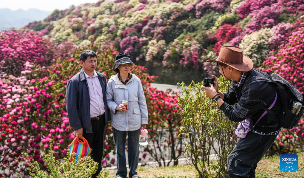 Tourists pose for photos at an azalea scenic area in Bijie, southwest China's Guizhou Province, March 30, 2024. (Xinhua/Tao Liang)