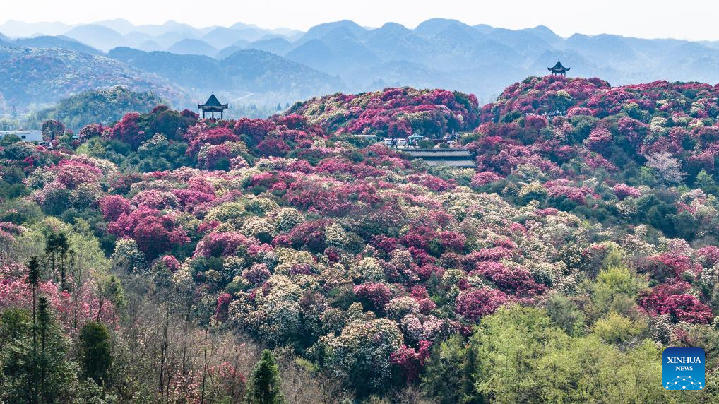 An aerial drone photo taken on March 30, 2024 shows a view of an azalea scenic area in Bijie, southwest China's Guizhou Province. (Xinhua/Tao Liang)