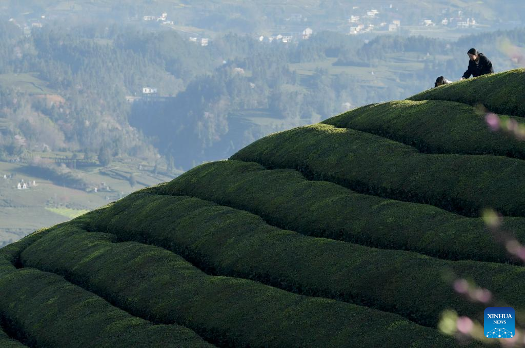 A farmer picks tea leaves at a tea garden in Zouma Town of Hefeng County, central China's Hubei Province, March 29, 2024. The county of Hefeng has made efforts in the coordinated development of tea planting and tourism industries to boost rural revitalization. (Photo by Yang Shunpi/Xinhua)