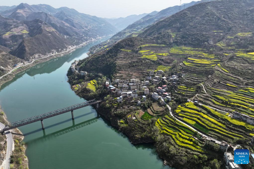 An aerial drone photo taken on March 20, 2024 shows the scenery of Yangchun Township in Nanzheng District of Hanzhong, northwest China's Shaanxi Province. (Xinhua/Shao Rui)