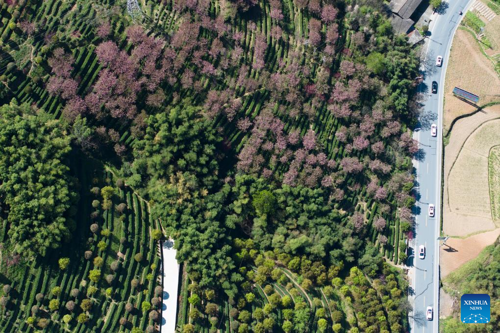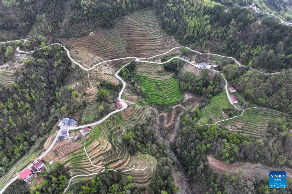 An aerial drone photo taken on March 27, 2024 shows a tea plantation in Shuanglong Town of Hanbin District in Ankang, northwest China's Shaanxi Province. (Xinhua/Shao Rui)