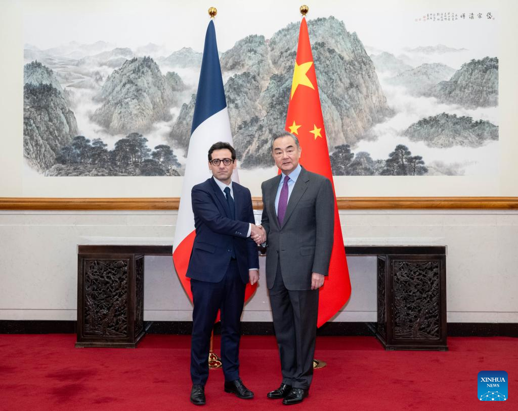 BEIJING, April 1 (Xinhua) -- Chinese Foreign Minister Wang Yi held talks with Stephane Sejourne, French minister for Europe and foreign affairs, in Beijing on Monday to discuss closer bilateral ties.