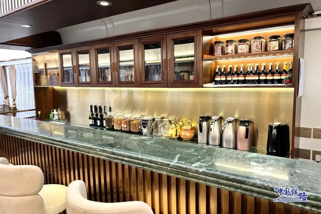 Photo shows the bar lounge of New Orient Express, a tourist-dedicated train that offers high-quality train travel around northwest China's Xinjiang Uygur Autonomous Region. (Photo/China Railway)