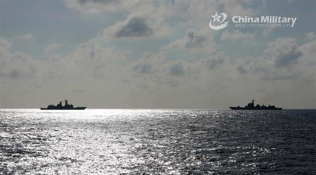 Warships attached to a destroyer flotilla with the navy under the PLA Southern Theater Command sail to positions during a comprehensive training exercise in late March, 2024. (eng.chinamil.com.cn/Photo by Huang Jiacheng)