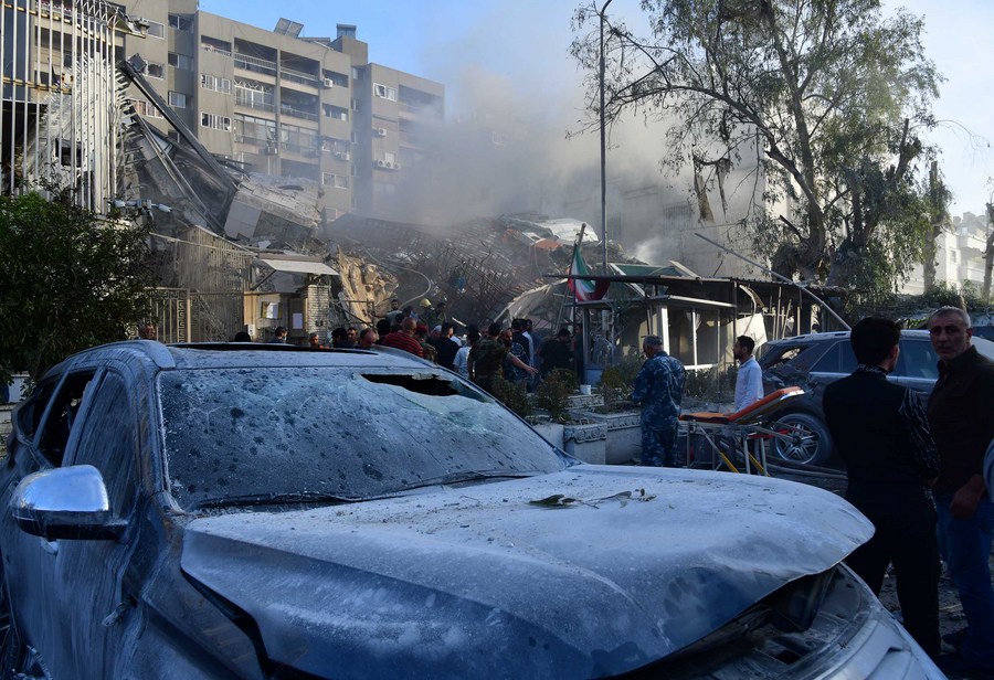 People gather at the site of an Israeli missile attack targeting the building of the Iranian Consulate in Damascus, Syria, April 1, 2024. (Photo by Ammar Safarjalani/Xinhua)
