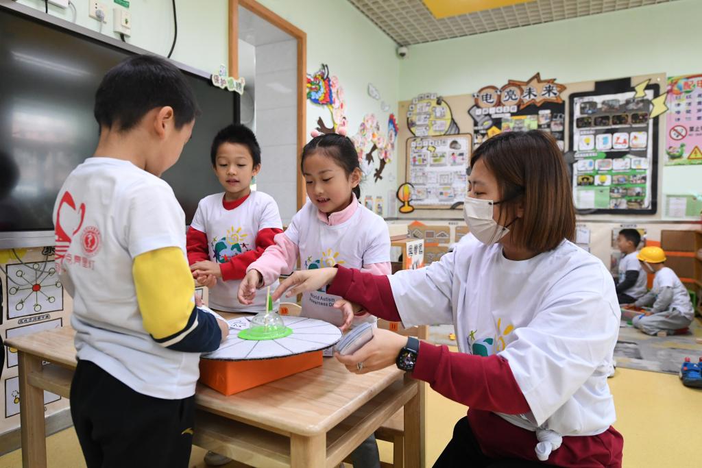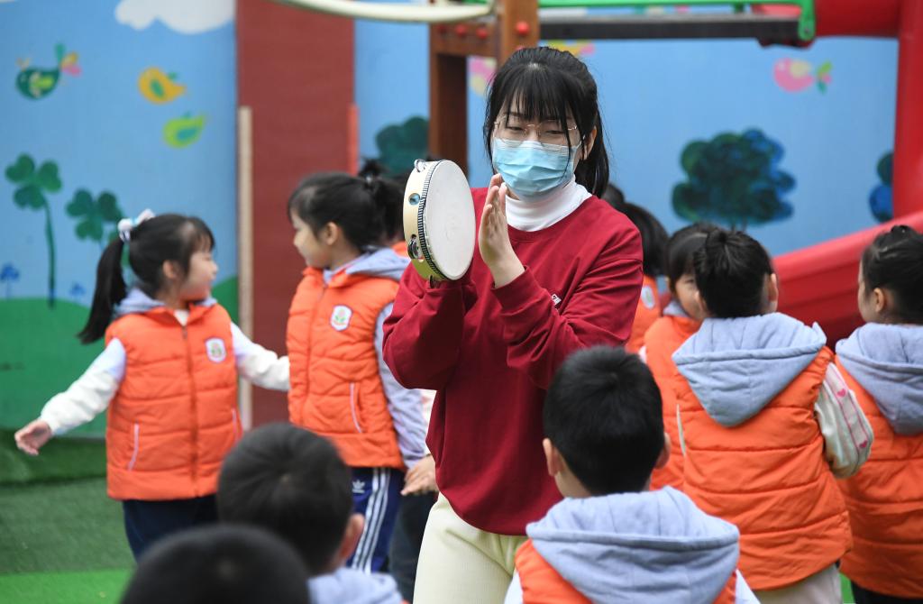 A teacher plays games with children at Peking University Health Science Center Kindergarten in Beijing, capital of China, March 27, 2024. (Xinhua/Ren Chao)