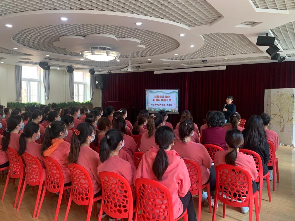 This file photo taken on March 22, 2022 shows Jia Meixiang, a medical expert from Peking University Sixth Hospital, speaking to the faculty of Peking University Health Science Center Kindergarten during a training on autistic children identification and early intervention at the kindergarten in Beijing, capital of China. (Xinhua)