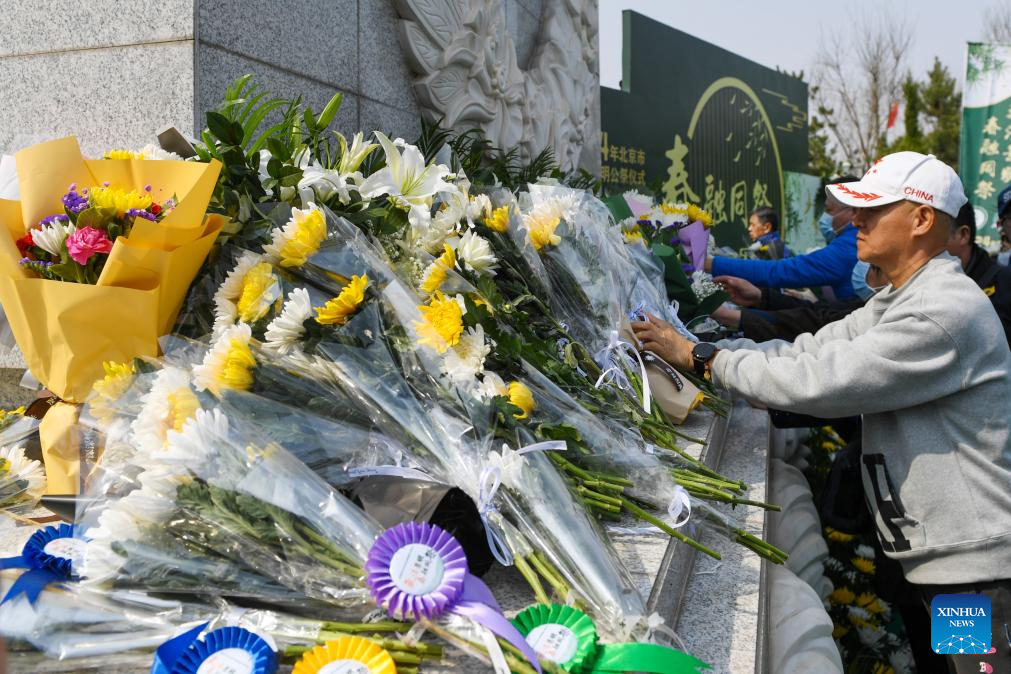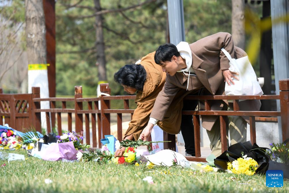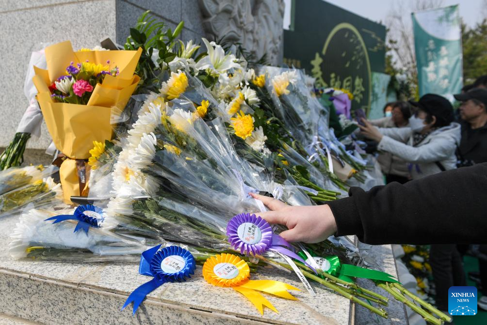 People lay flowers to mourn the deceased at a cemetery in Beijing, capital of China, April 2, 2024. The Qingming Festival, or Tomb-Sweeping Day, falls on Thursday this year. It is a traditional Chinese festival that pays tribute to the deceased and is a time for people to worship their ancestors. (Xinhua/Ju Huanzong)