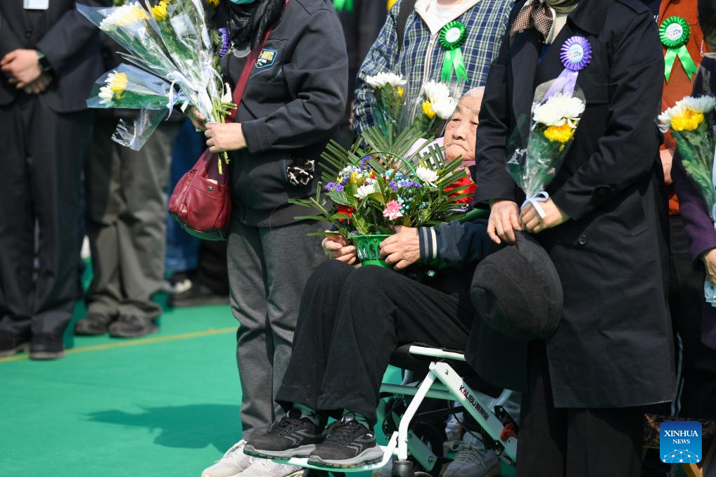 People holding flowers mourn the deceased at a cemetery in Beijing, capital of China, April 2, 2024. The Qingming Festival, or Tomb-Sweeping Day, falls on Thursday this year. It is a traditional Chinese festival that pays tribute to the deceased and is a time for people to worship their ancestors. (Xinhua/Ju Huanzong)