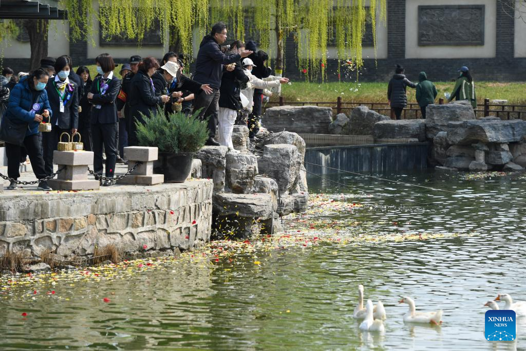People scatter petals to a river to mourn the deceased at a cemetery in Beijing, capital of China, April 2, 2024. The Qingming Festival, or Tomb-Sweeping Day, falls on Thursday this year. It is a traditional Chinese festival that pays tribute to the deceased and is a time for people to worship their ancestors. (Xinhua/Ju Huanzong)