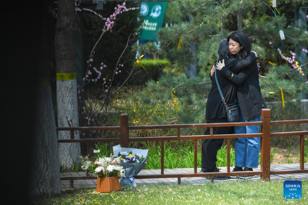 People hug each other after laying flowers to mourn the deceased at a cemetery in Beijing, capital of China, April 2, 2024. The Qingming Festival, or Tomb-Sweeping Day, falls on Thursday this year. It is a traditional Chinese festival that pays tribute to the deceased and is a time for people to worship their ancestors. (Xinhua/Ju Huanzong)