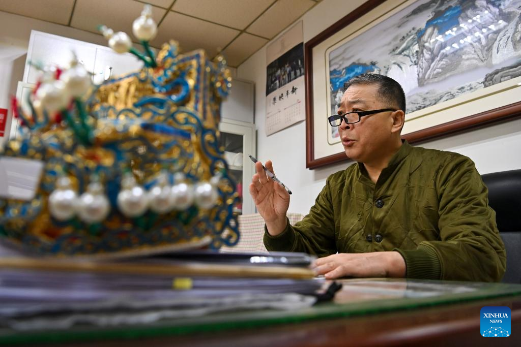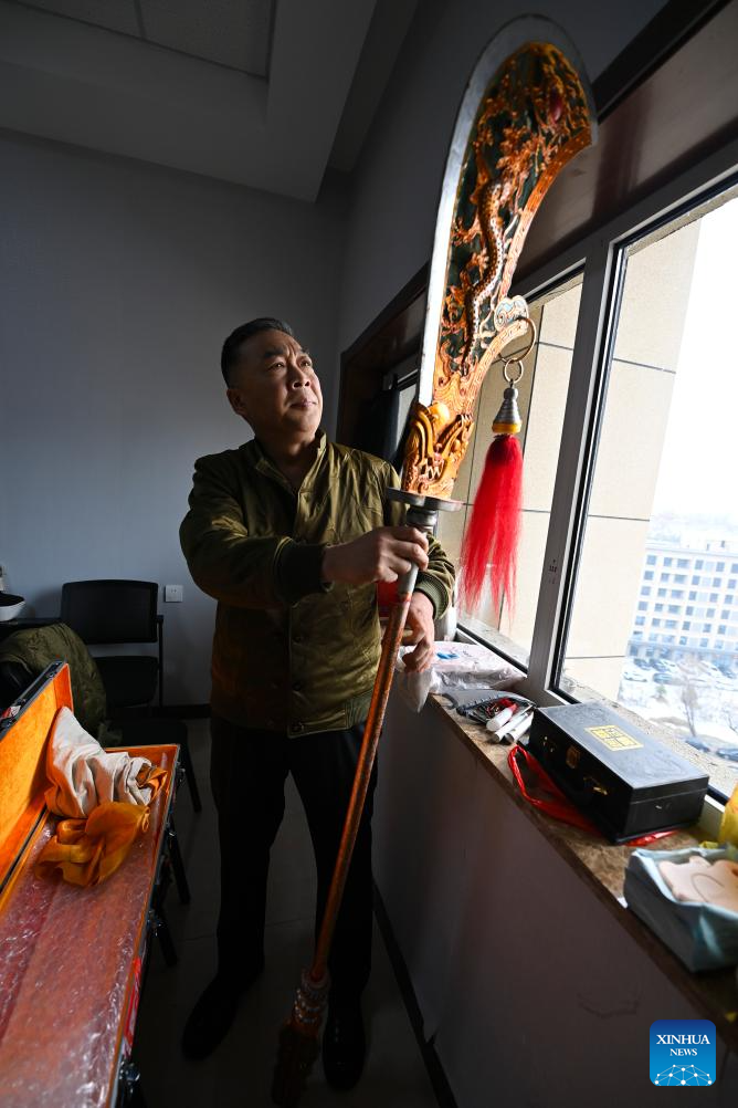 Wu Lingyun checks the props ahead of a performance in Yingze District of Taiyuan, north China's Shanxi Province, Feb. 2, 2024. (Xinhua/Yang Chenguang)