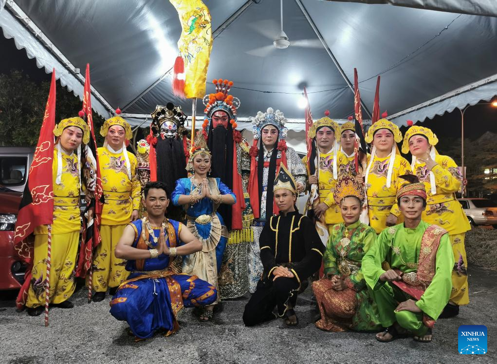 This file photo taken on Oct. 23, 2019 shows Wu Lingyun (4th L, back) and his troupe members posing for a photo with local actors during an international Guan Gong cultural festival in Malaysia. (Xinhua)