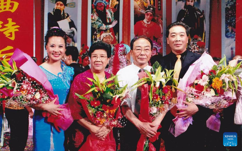 This is an undated file photo of Wu Lingyun (1st R) and his wife Wang Chunmei (1st L), his mother Yan Huizhen (2nd L), and his father Wu Zhong. All of them are China's national first-class actors. (Xinhua)