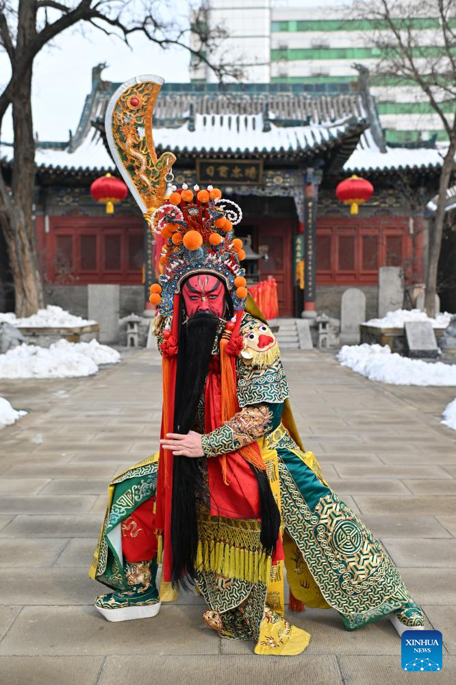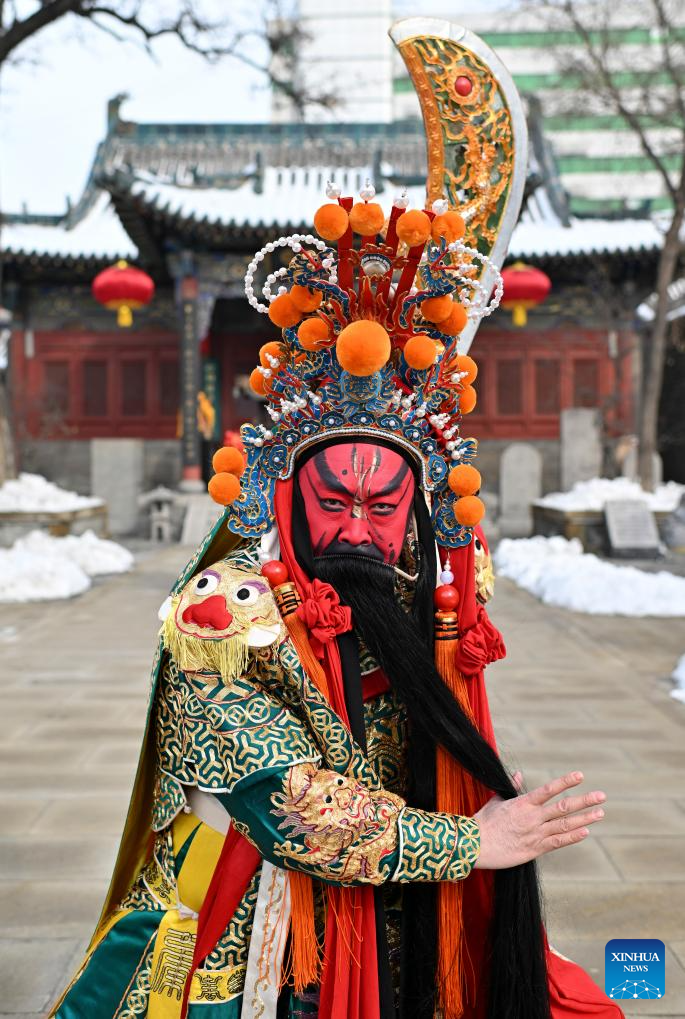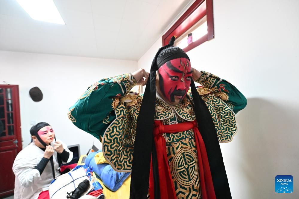 Wu Lingyun (R) prepares for a performance at the Temple of Guan Yu in Yingze District of Taiyuan, north China's Shanxi Province, Feb. 23, 2024. (Xinhua/Zhan Yan)