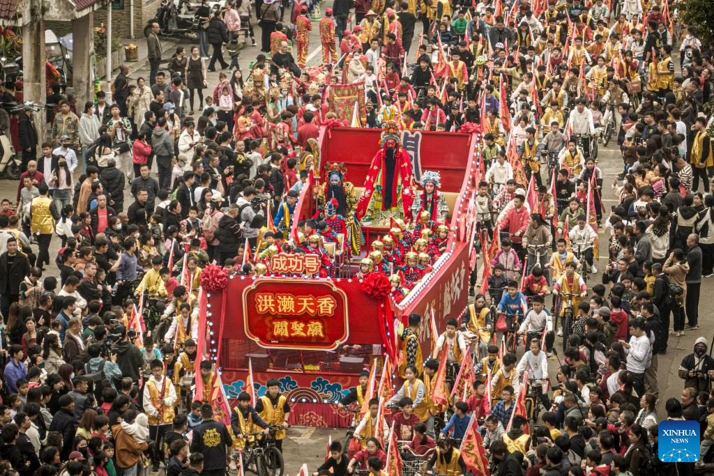 Wu Lingyun (C) and his troupe members take part in an activity in Honglai Township of Nan'an City, southeast China's Fujian Province, March 16, 2024. (Xinhua)
