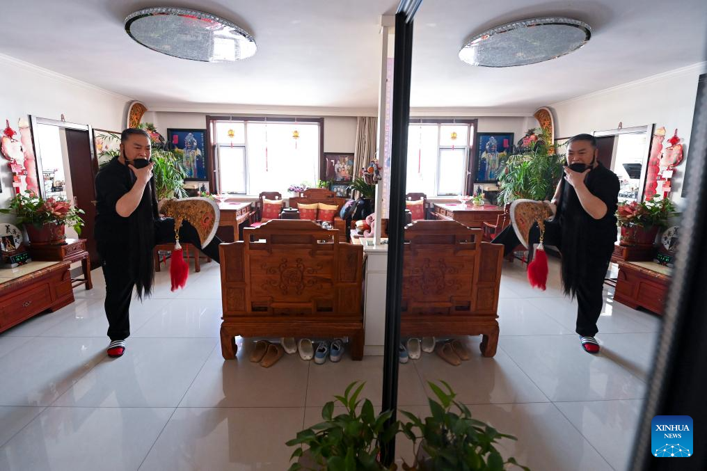 Wu Lingyun prepares for performances at home in Xinghualing District of Taiyuan, north China's Shanxi Province, March 26, 2024. (Xinhua/Yang Chenguang)