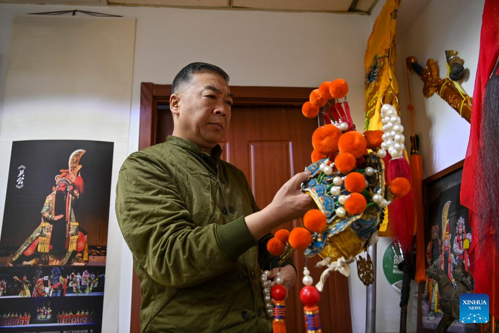 Wu Lingyun arranges props at the Jin Opera art research institute in Taiyuan, north China's Shanxi Province, Feb. 6, 2024. (Xinhua/Yang Chenguang)