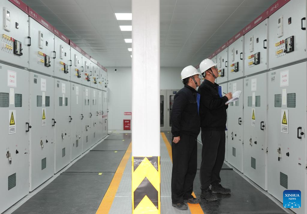 Staff members inspect the power feeder panel at a photovoltaic power project in Sanmen County of Taizhou City, east China's Zhejiang Province, March 26, 2024. The photovoltaic power project in Sanmen County has generated over 20 million kWh of electricity. The project had a planned area of about 494 acres in size and was officially integrated into the electrical grid on Nov. 30, 2023. Following full integration into the grid, it is expected to produce up to 80 million kWh of electricity annually. (Xinhua/Weng Xinyang)