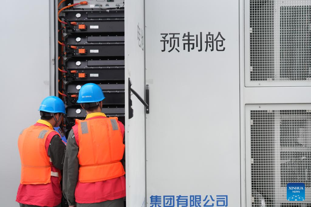 Staff members inspect the battery bank at a photovoltaic power project in Sanmen County of Taizhou City, east China's Zhejiang Province, March 26, 2024. The photovoltaic power project in Sanmen County has generated over 20 million kWh of electricity. The project had a planned area of about 494 acres in size and was officially integrated into the electrical grid on Nov. 30, 2023. Following full integration into the grid, it is expected to produce up to 80 million kWh of electricity annually. (Xinhua/Weng Xinyang)