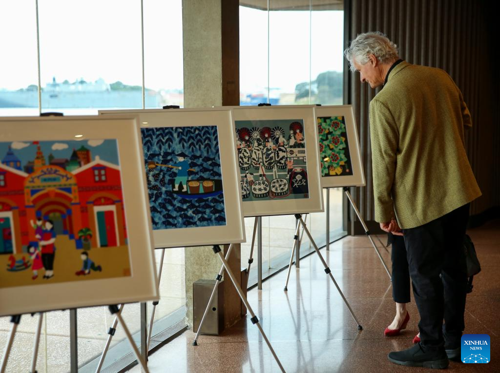 A visitor looks at a painting displayed during an opening activity of the "Fair South Recalled -- Shanghai Intangible Cultural Heritage Painting Exhibition" in Sydney, Australia, April 2, 2024. (Xinhua/Ma Ping)