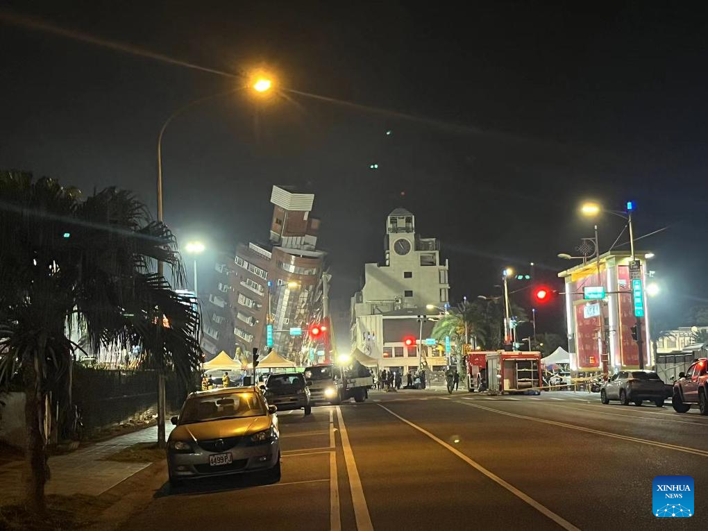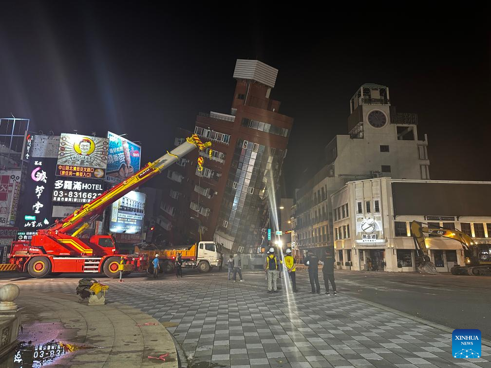 This photo taken on April 3, 2024 shows a tilted building after a 7.3-magnitude earthquake jolted the sea area near Hualien, southeast China's Taiwan. The 7.3-magnitude quake in China's Taiwan on Wednesday morning had left nine people dead and 1,011 people injured as of 10 p.m., according to the local emergency operation center. (Xinhua/Zhao Bo)