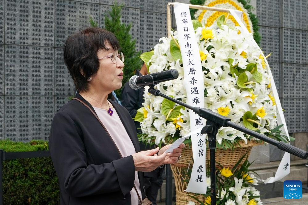 Tamaki Matsuoka, founder of the "Connecting Memories of Nanjing" civil group, speaks during a memorial ceremony at the Memorial Hall of the Victims in Nanjing Massacre by Japanese Invaders, in Nanjing, east China's Jiangsu Province, April 3, 2024.