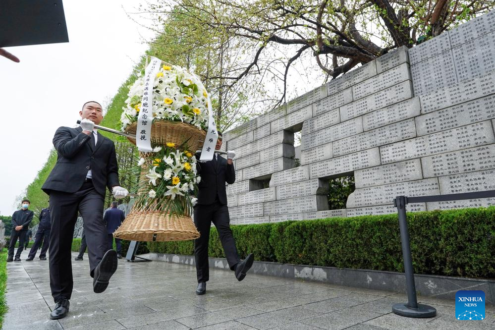Staff members present a flower basket to victims of the Nanjing Massacre at the Memorial Hall of the Victims in Nanjing Massacre by Japanese Invaders, in Nanjing, east China's Jiangsu Province, April 3, 2024.