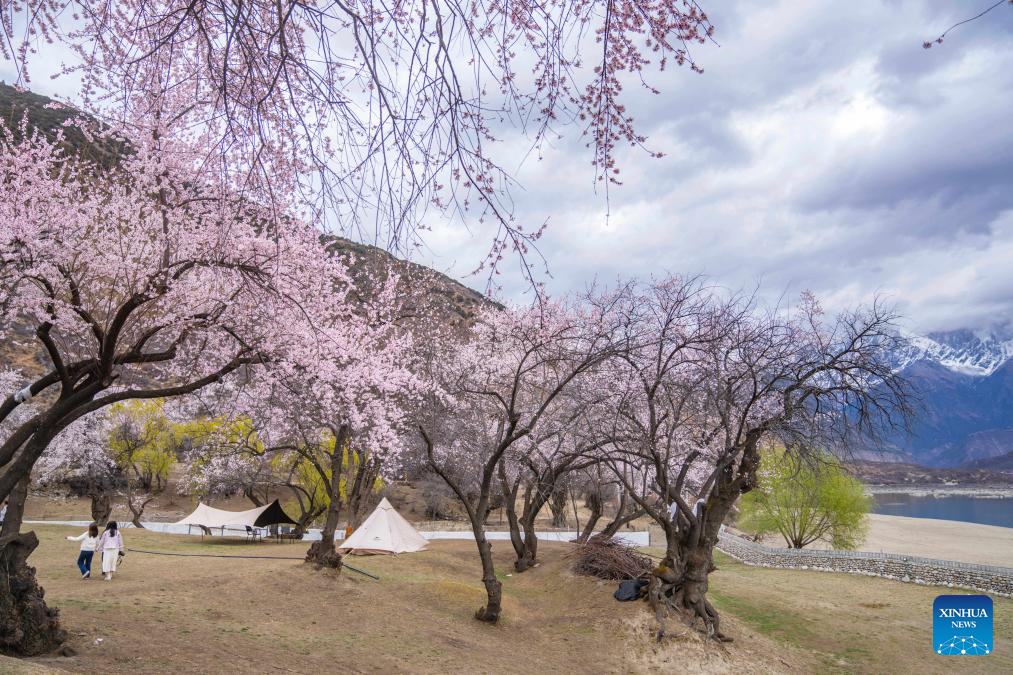 Tourists visit an area of peach trees with Mount Namjagbarwa in the background near Suosong Village in Nyingchi, southwest China's Xizang Autonomous Region, April 2, 2024. (Xinhua/Sun Fei)
