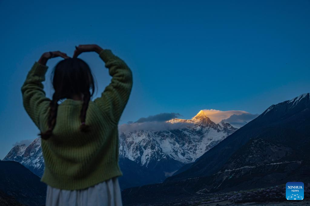 A tourist poses with Mount Namjagbarwa in the background in Suosong Village in Nyingchi, southwest China's Xizang Autonomous Region, April 1, 2024. (Xinhua/Sun Fei)