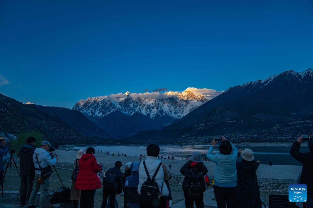 Tourists take photos of Mount Namjagbarwa in Suosong Village in Nyingchi, southwest China's Xizang Autonomous Region, April 1, 2024. (Xinhua/Sun Fei)