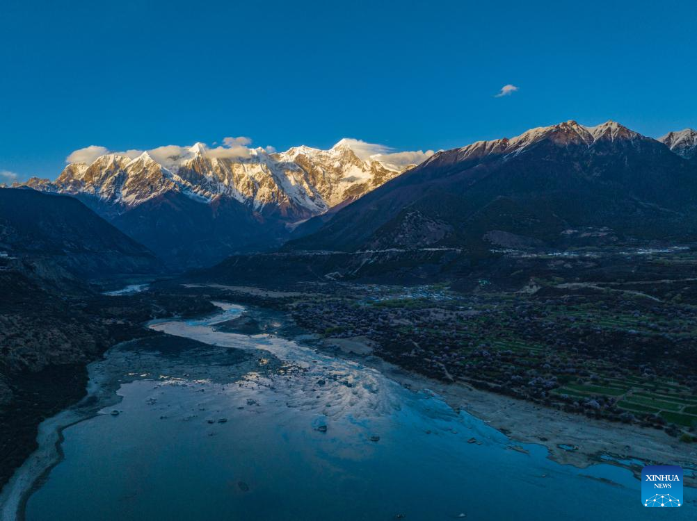 An aerial drone photo taken on April 1, 2024 in Suosong Village of Nyingchi, southwest China's Xizang Autonomous Region, shows the scenery of Mount Namjagbarwa. (Xinhua/Sun Fei)