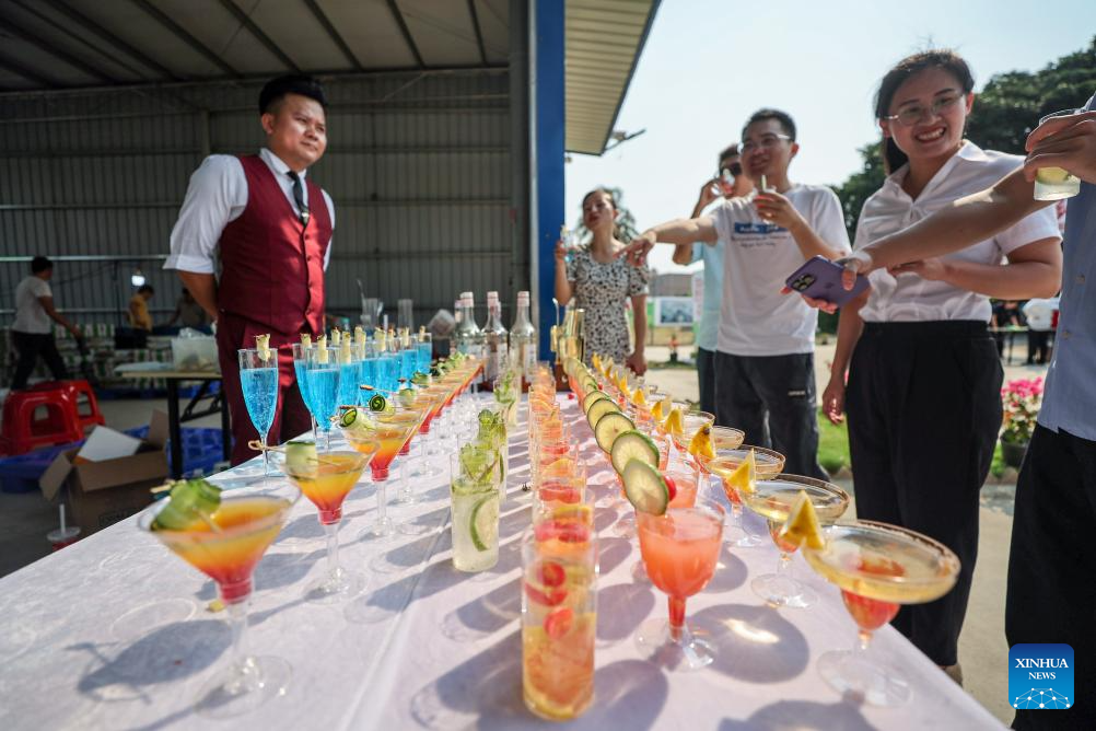 Tourists taste drinks made from cherry tomatoes at a cherry tomato picking festival in Tanli Village of Dingan County, south China's Hainan Province, April 3, 2024. Dingan County held a cherry tomato picking festival on Wednesday. Various activities were carried out to promote the cherry tomato planting industry and local tourism. (Xinhua/Zhang Liyun)